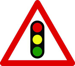 When you are approaching traffic lights, you may see a warning sign like the one shown below. Please be aware that you won’t always see this sign when traffic lights are ahead so be prepared to stop at the lights wherever you are driving.
