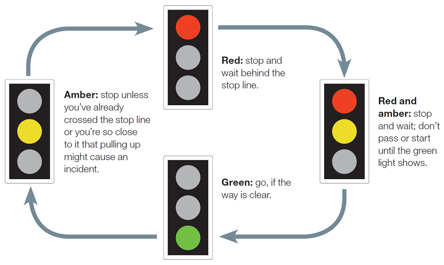 Amber: Stop. If you have already crossed the stop line when the amber light appears or are positioned close to the stop line where stopping may be dangerous, you should proceed.
